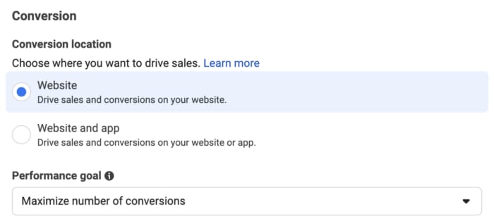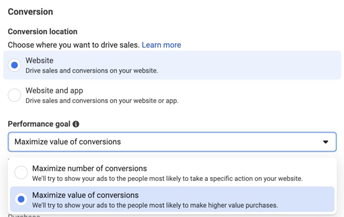 On the first one, Meta's goal is to generate as many conversions as possible by showing the ads to people most likely to make a purchase on your website.