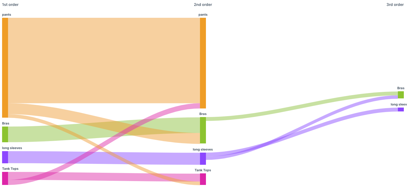 However, those buying Tank tops behave differently: half of them buy another one in the second order, and the other half buy pants.